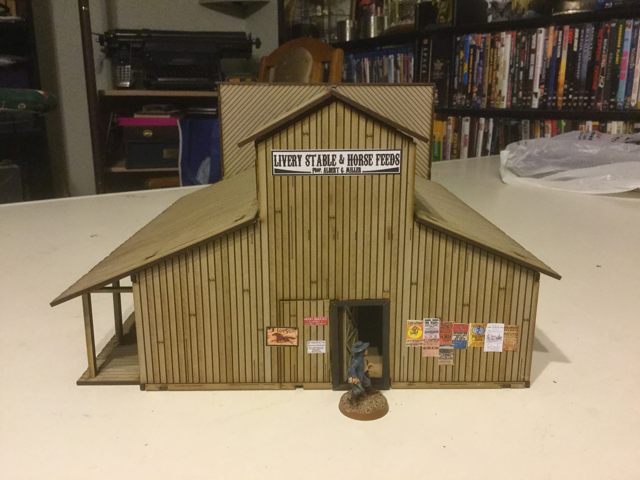 Cutting the tiny posters and handbills for individual application was a bit tedious, but looks miles better than a single piece with some artificial insets. The working doors, exquisitely detailed windows and detachable roofs result in a large and brilliant looking building, with good accessibility and tremendous potential for dramatic gunfights. Thanks tons, Jim!